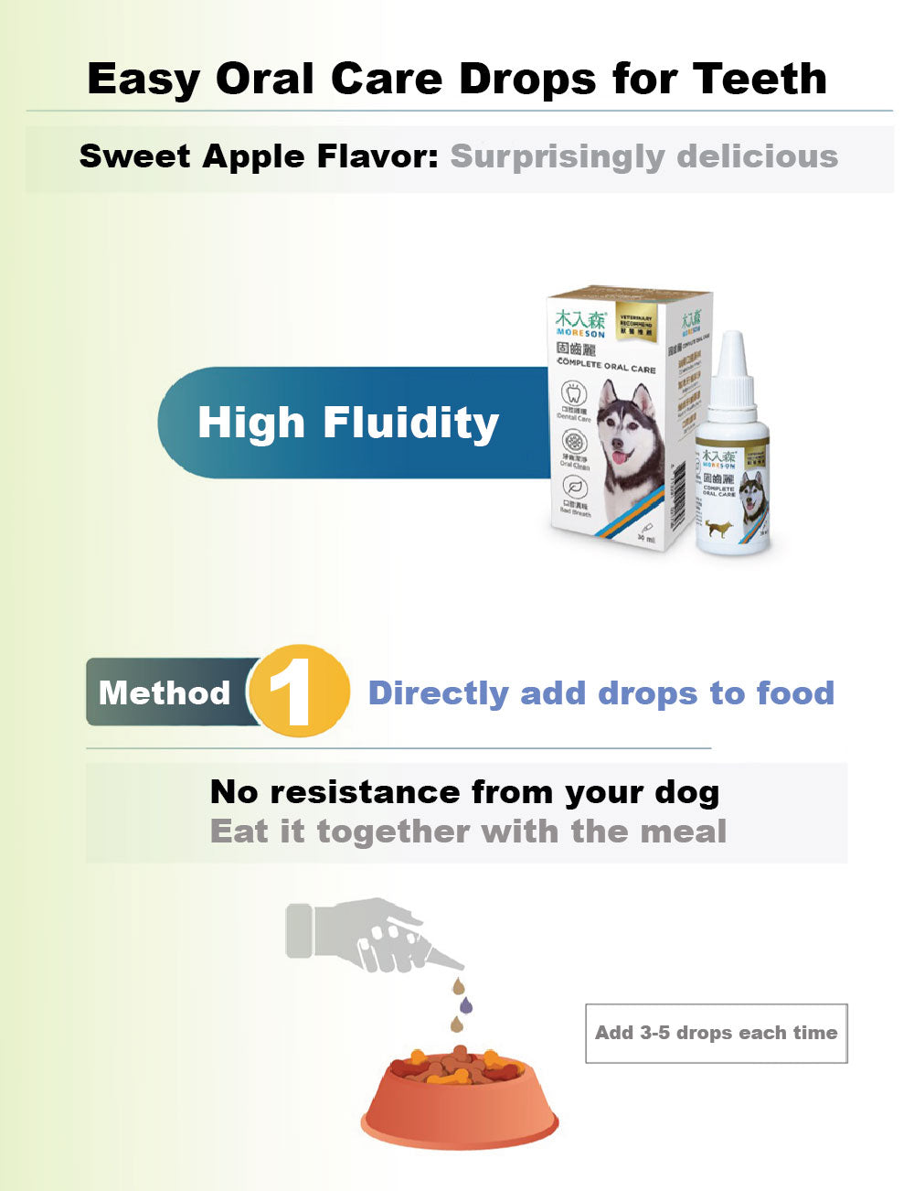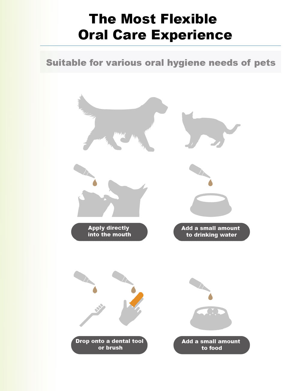 Complete Oral Care comes in a liquid form with a slender dropper, making it convenient to apply the dental solution deep into your dog's mouth. It can also be added to drinking water or food, allowing your dog's oral hygiene to be taken care of while they drink or eat.
