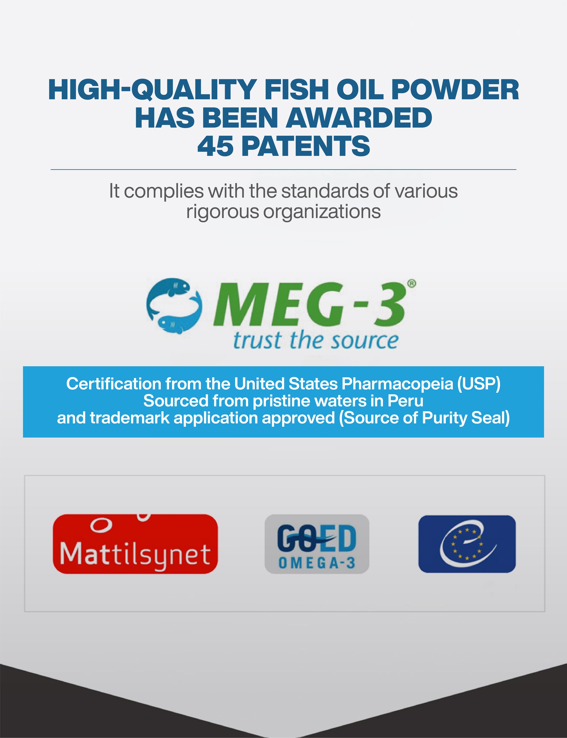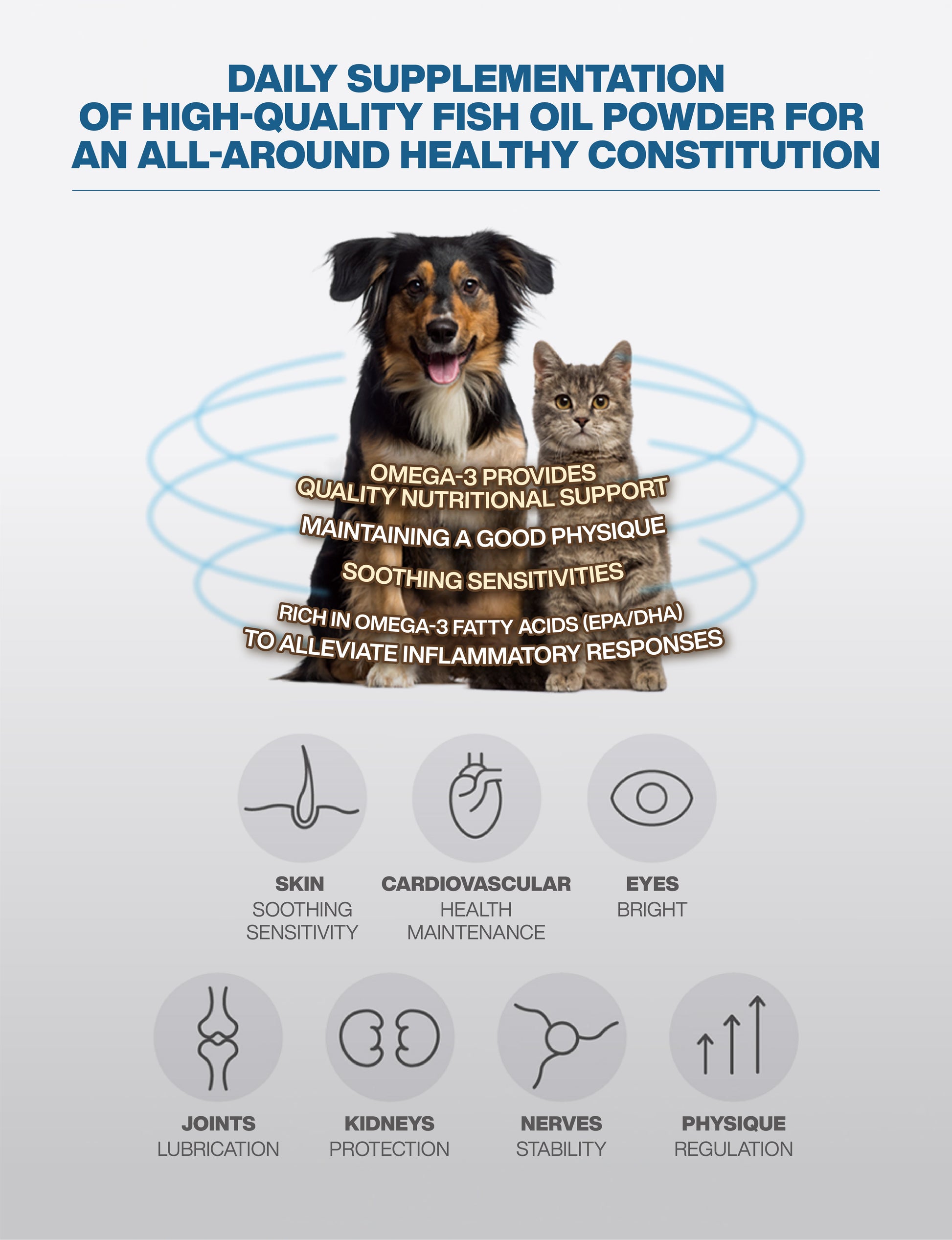 According to the American College of Veterinary Nutrition, it is recommended to supplement dogs and cats with Omega-3 in their diet. Omega-3 provides multiple protection for various organs, including the skin, heart, eyes, joints, nerves, and kidneys. It also helps establish a healthy physique. Our Refined Fish Oil Powder contains the recommended dosage of Omega-3 and EPA+DHA as suggested by the American College of Veterinary Nutrition. It utilizes a patented double-layered coating method to encapsulate the essential fish oil, significantly reducing the fishy odor and enhancing the palatability for dogs and cats. It also ensures the preservation of high-quality nutrients and minimizes the risk of spoilage. We independently test the product for heavy metals and environmental hormone levels to maintain the highest quality standards for our fish oil powder (which is also certified by the United States Pharmacopeia). Compared to liquid fish oil, the powdered form is gentler on the stomach and more suitable for dogs and cats, reducing the risk of poor absorption and diarrhea issues associated with liquid oils.